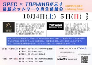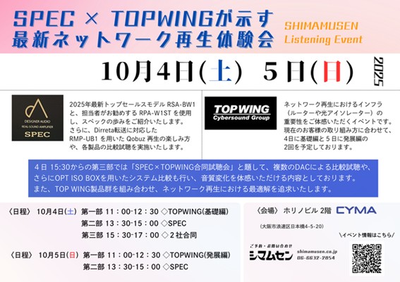 10月6日 シマムセンで開催されたシマムセンCYMA で開催された『SPEC × TOPWINGが示す最新ネットワーク再生体験会』に行ってきました。 【開催日】10月5日(日) 【開催時間】11:00~12:30 【開催場所】シマムセンCYMA SPEC × TOPWING 二日間は基礎編、発展偏と別れ、それぞれSPEC とTOPWINGおよび2社のジョイントプログラムがあり、10月5日TOPWINGの「発展編」に参加しました。 経過の詳細は、試聴会・訪問記のページで紹介します。